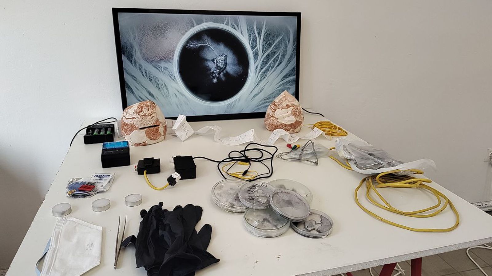 As part of this process, embodied speculative technologies take shape, intertwining exercises in fiction, biological experimentation, and artistic practice. Dreaming about mushrooms […] is articulated through multiple tentacles that, like the hyphae of a mycelium, gather and connect different moments of research and creation.